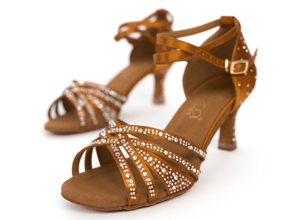 Vă prezentăm noul brand cehesc Elza, creat special pentru dansatoarele exigente. Pantofii de dans Elza sunt realizați din materiale exclusive de înaltă calitate. Pentru producerea acestor pantofi am ales un satin bej închis, extrem de lucios și rafinat (fabricat de aceeași companie care produce satinul pentru Supadance). Acest tip de satin, atât de exclusiv și strălucitor, nu se regăsește la alți pantofi de dans de pe piață, iar în această variantă pantofii arată cu adevărat spectaculos. Sunt singurii pantofi de dans care dispun de tocuri silențioase cu strat dublu, excelent echilibrate și perfect stabile. Talpa interioară este de asemenea căptușită și confecționată din microfibră de calitate superioară, ce absoarbe eficient umezeala.